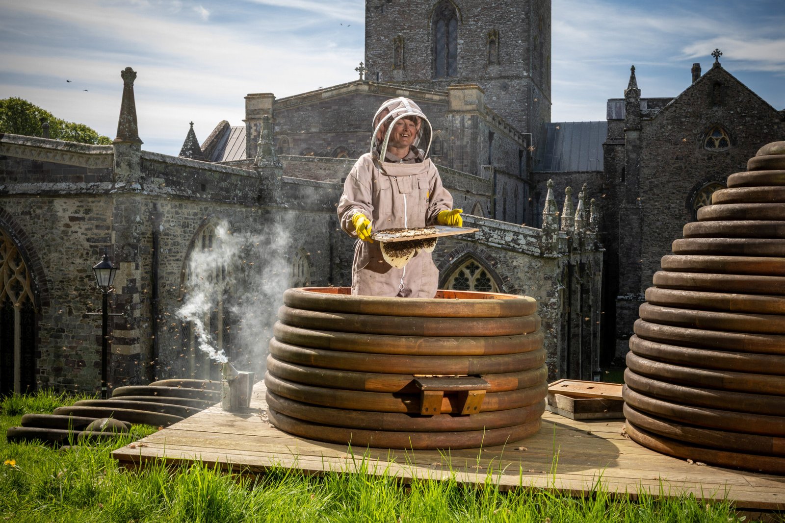 Pictured: Local beekeeper, Gayle Twitchen, tends to the skeps at St Davids Cathedral. Joann Randles/HIVE INSIDER